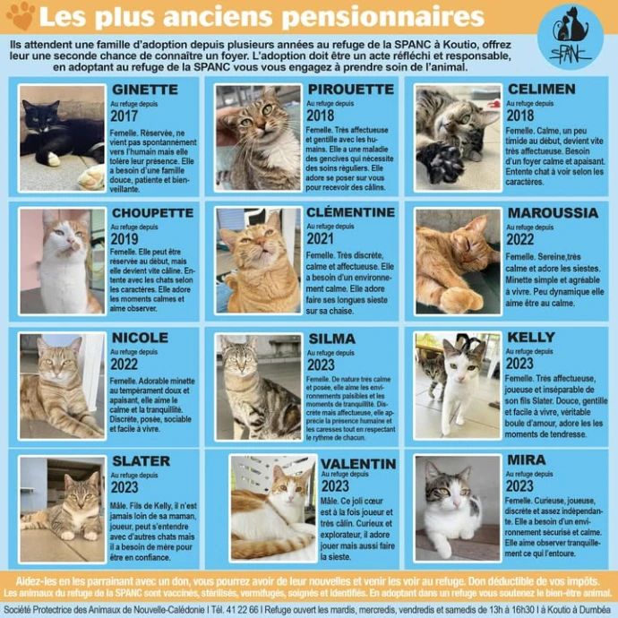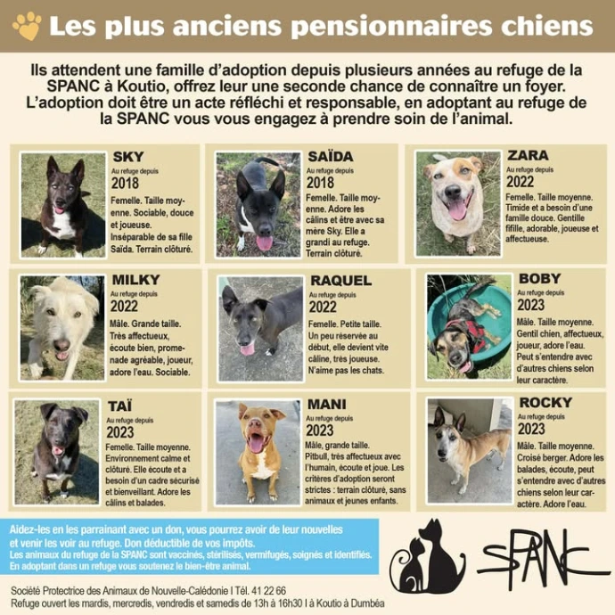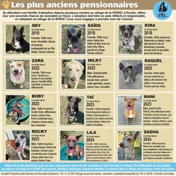 La SPANC recueille en son refuge de Koutio les animaux abandonnés, perdus ou errants ; ceux-ci sont nourris, soignés, vaccinés, sociabilisés, identifiés et stérilisés.